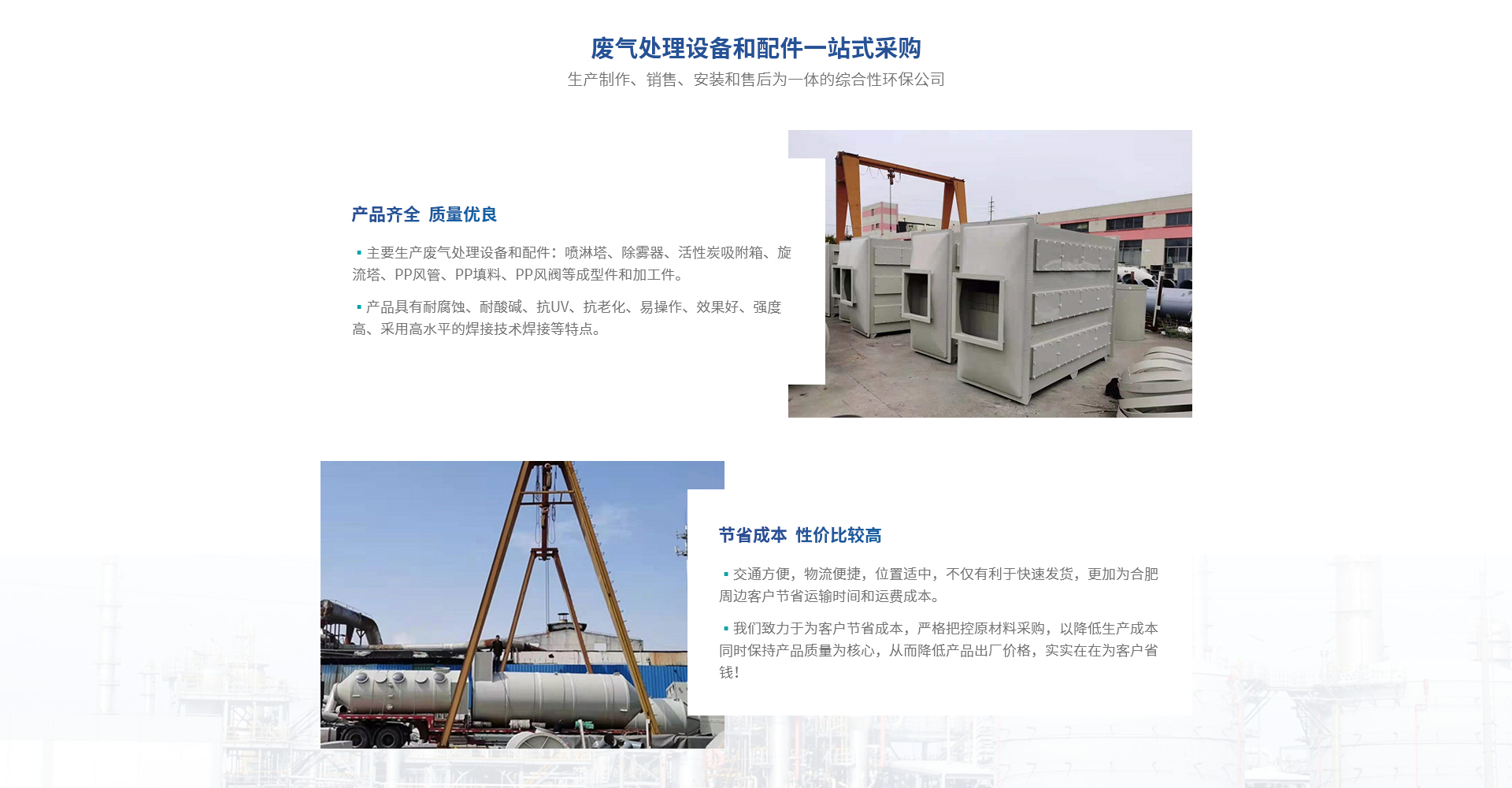 合肥熙誠環(huán)保科技有限公司是熙誠環(huán)保合肥分公司,是一家集產(chǎn)品生產(chǎn)制作、銷售、安裝和售后為一體的綜合性環(huán)保公司。主要生產(chǎn)廢氣處理設(shè)備和配件:噴淋塔、除霧器、活性炭吸附箱、旋流塔、PP風(fēng)管、PP填料、PP風(fēng)閥等成型件和加工件,產(chǎn)品具有耐腐蝕、耐酸堿、抗UV、抗老化、易操作、效果好、強(qiáng)度高、采用高水平的焊接技術(shù)焊接等特點(diǎn);滿足客戶一站式采購的要求。廣泛應(yīng)用于電子業(yè)、化工業(yè)、醫(yī)藥業(yè)、紡織業(yè)、橡塑業(yè)、汽車業(yè)、...